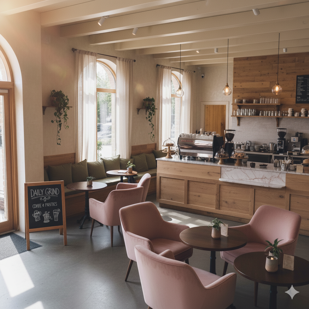 - Warm Atmosphere – Earthy tones, natural light, and cozy seating
